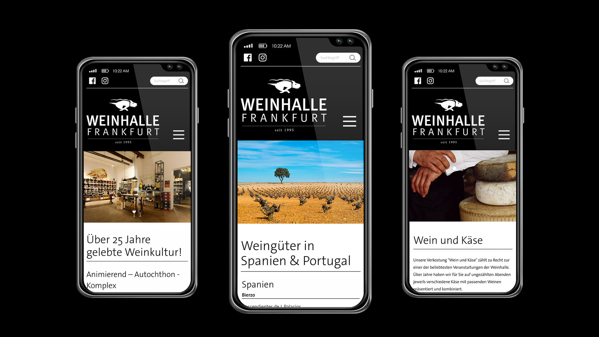 rau kommunikation ist von Beginn an Partner der Weinhalle Frankfurt: Als erfahrene Werbe- und Internetagentur haben wir das gesamte Brand Design übernommen. Die von uns konzipierte und programmierte responsive Website spiegelt das Selbstbild des Unternehmens wider und informiert die Kundinnen und Kunden schnell und übersichtlich. Selbstverständlich ist die Site suchmaschinenoptimiert.